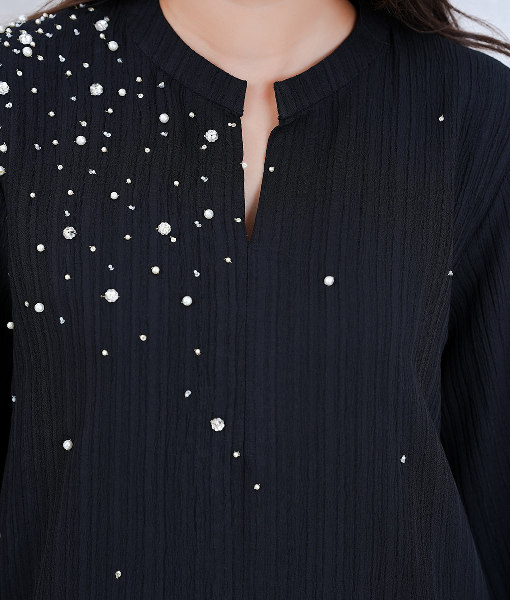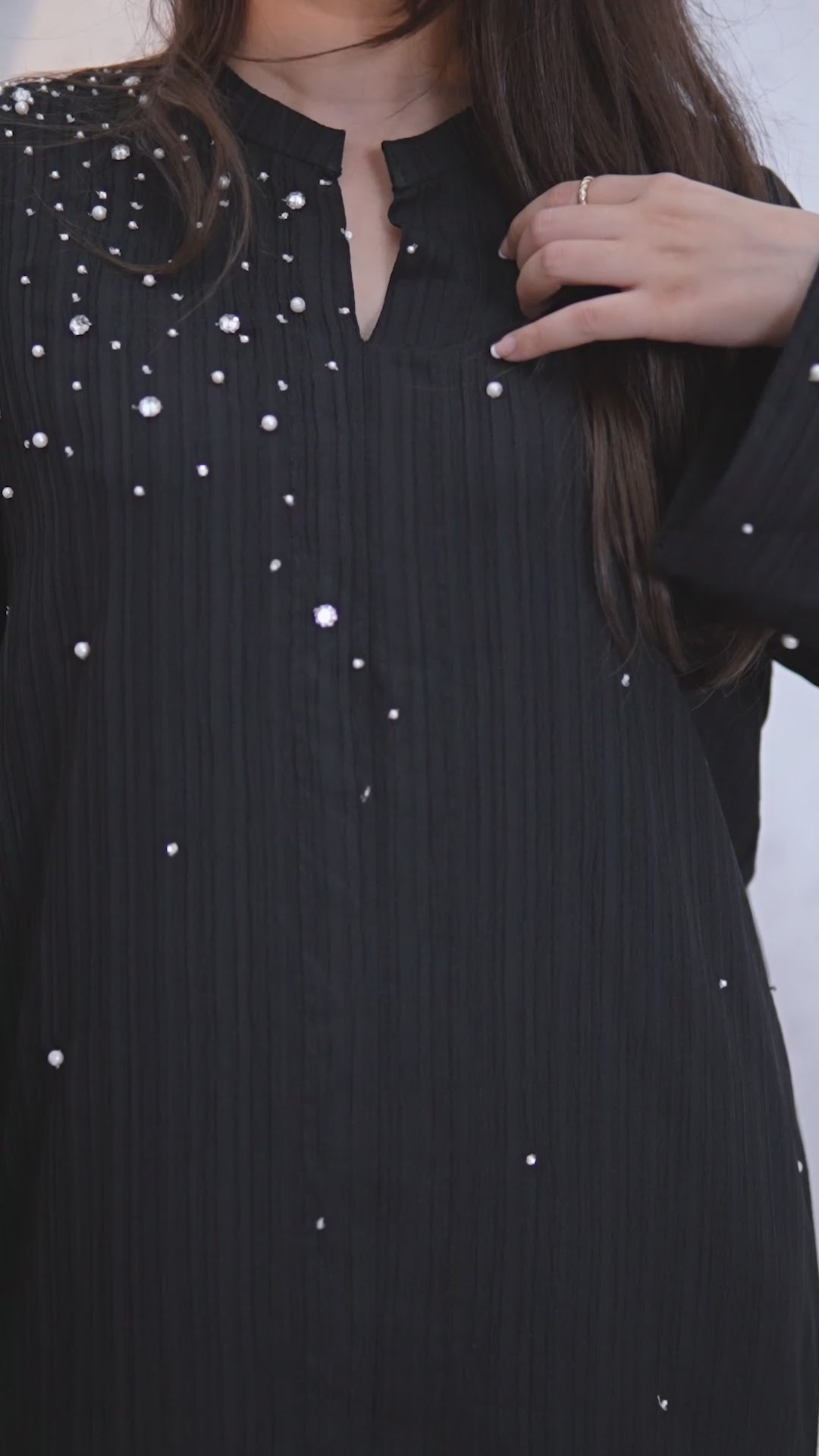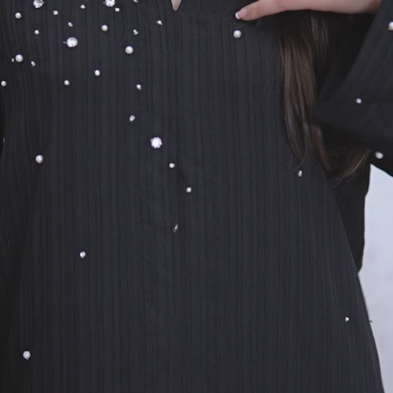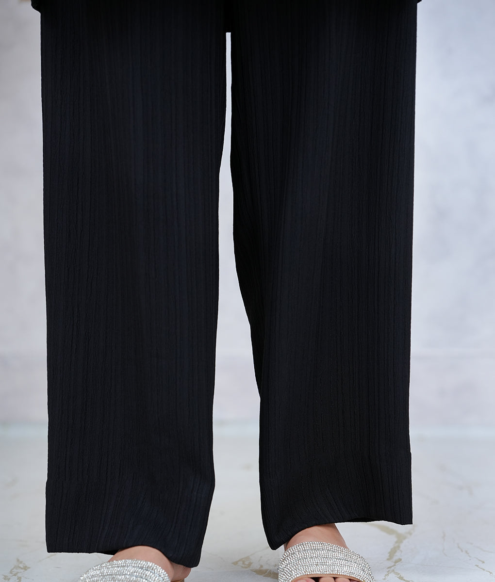 This stylish and elegant black Co-Ord set is made from flowy, textured, stretchable fabric. The shirt features hand-embellished detailing on the front and sleeves, and the straight trousers complete the look with a clean, trendy fit.