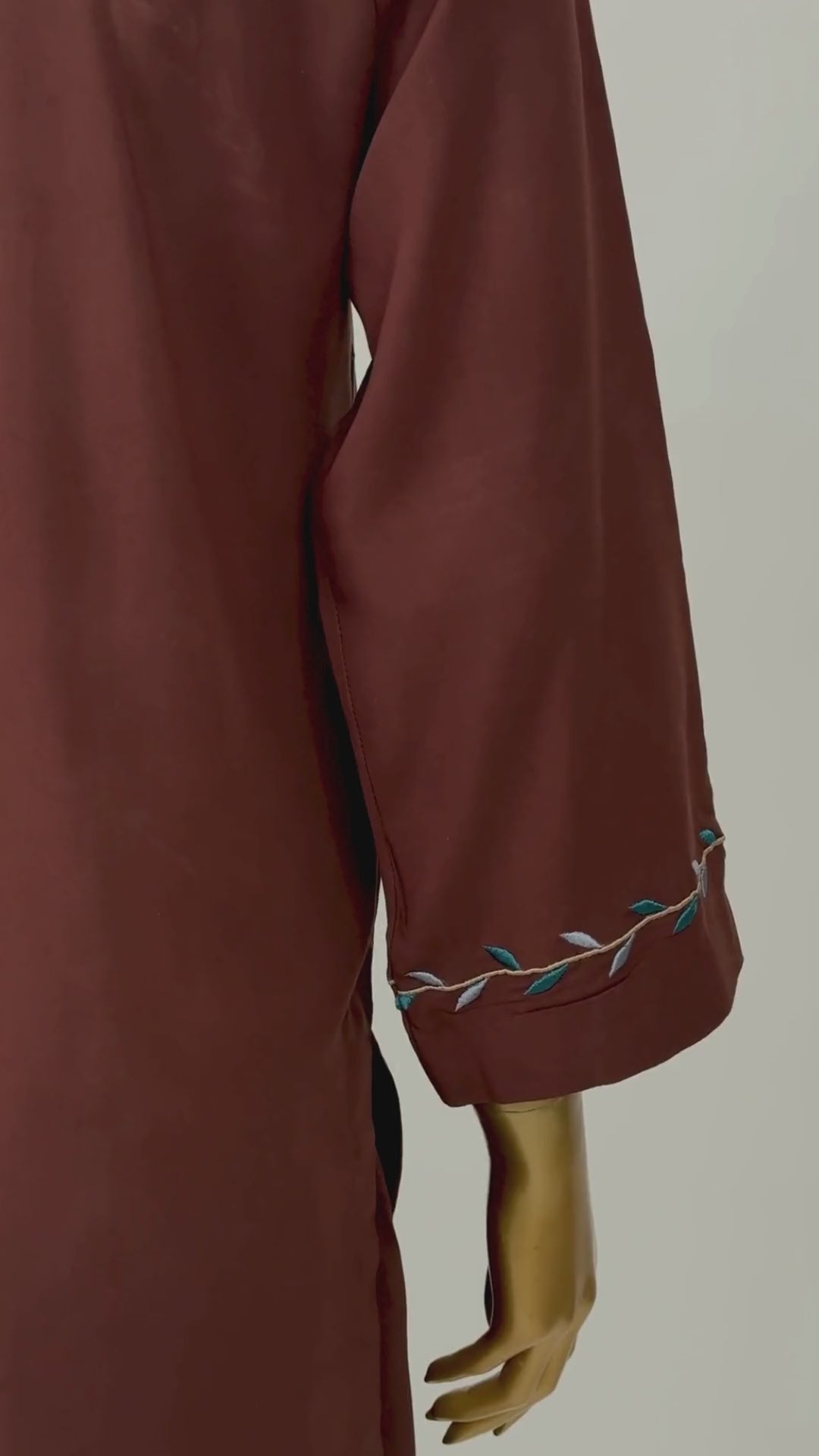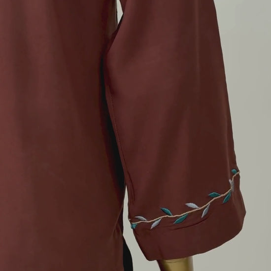 This is a simple two-piece outfit in a dark brown color. The straight-cut shirt has full sleeves and a modest neckline with light embroidered detailing along the neckline and sleeve cuffs. The matching wide-leg trousers complete the look, making the outfit elegant, comfortable, and suitable for casual wear.
