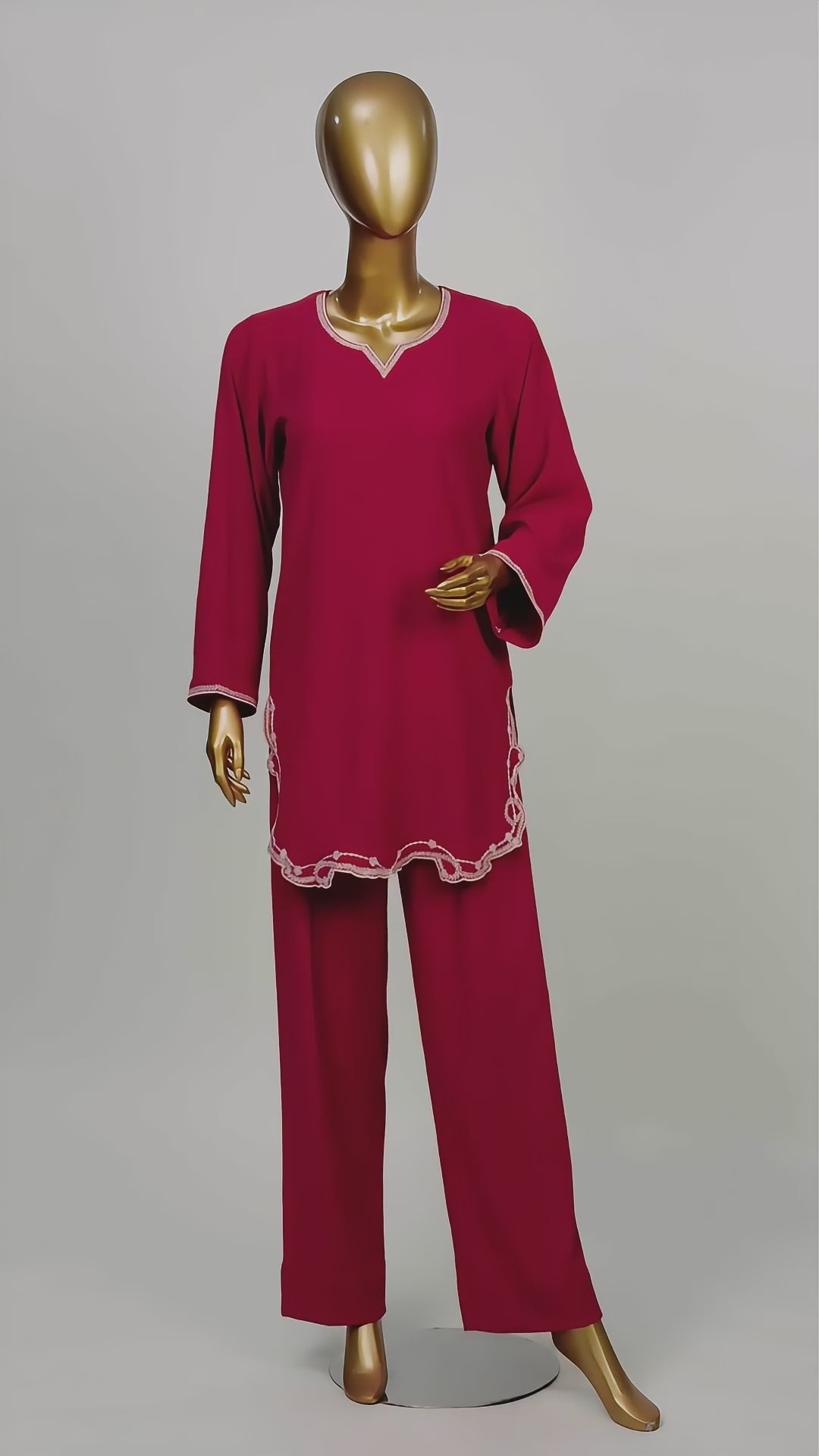 This dark pink Co-Ord set is made with textured stretchable fabric to offer both style and comfort. The shirt features an embroidered neckline, round daman, and full sleeves. The straight trousers complete the sleek, stylish look.