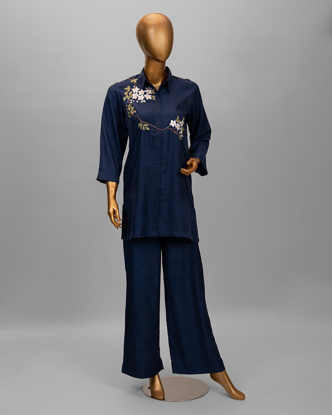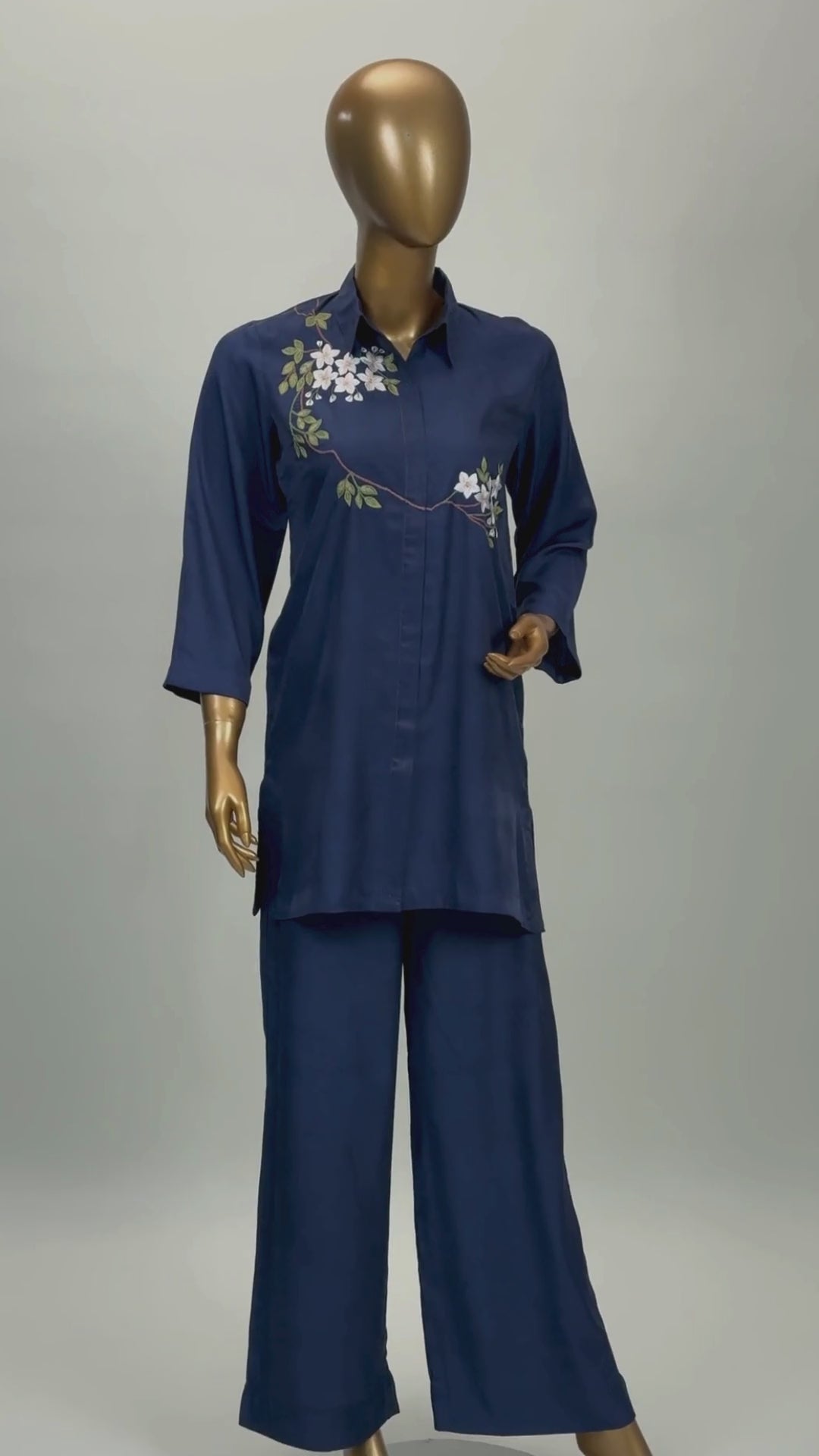This chic, modern Persian blue co-ord set is beautifully designed with georgette fabric for a refined, structured silhouette. The shirt features a front opening with 3/4 sleeves and gorgeous embroidery running diagonally from one shoulder to the other. To complete the look, you have elegant straight trousers.