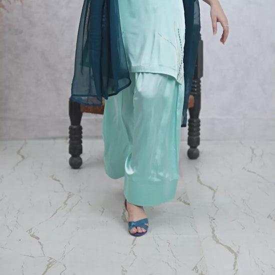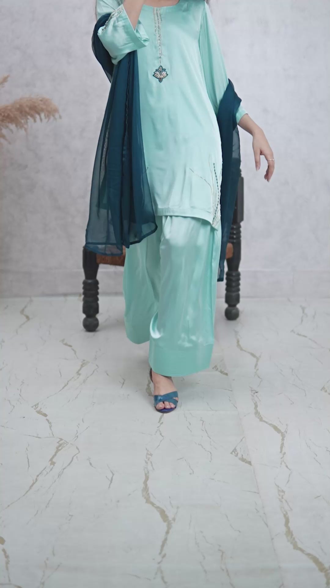 For something especially graceful, this light green silk outfit is a go-to. It features hand embroidery on the neckline, sleeves, and daman, and to complete the look, it is paired perfectly with a farshi shalwar and a turquoise hand-embellished dupatta.