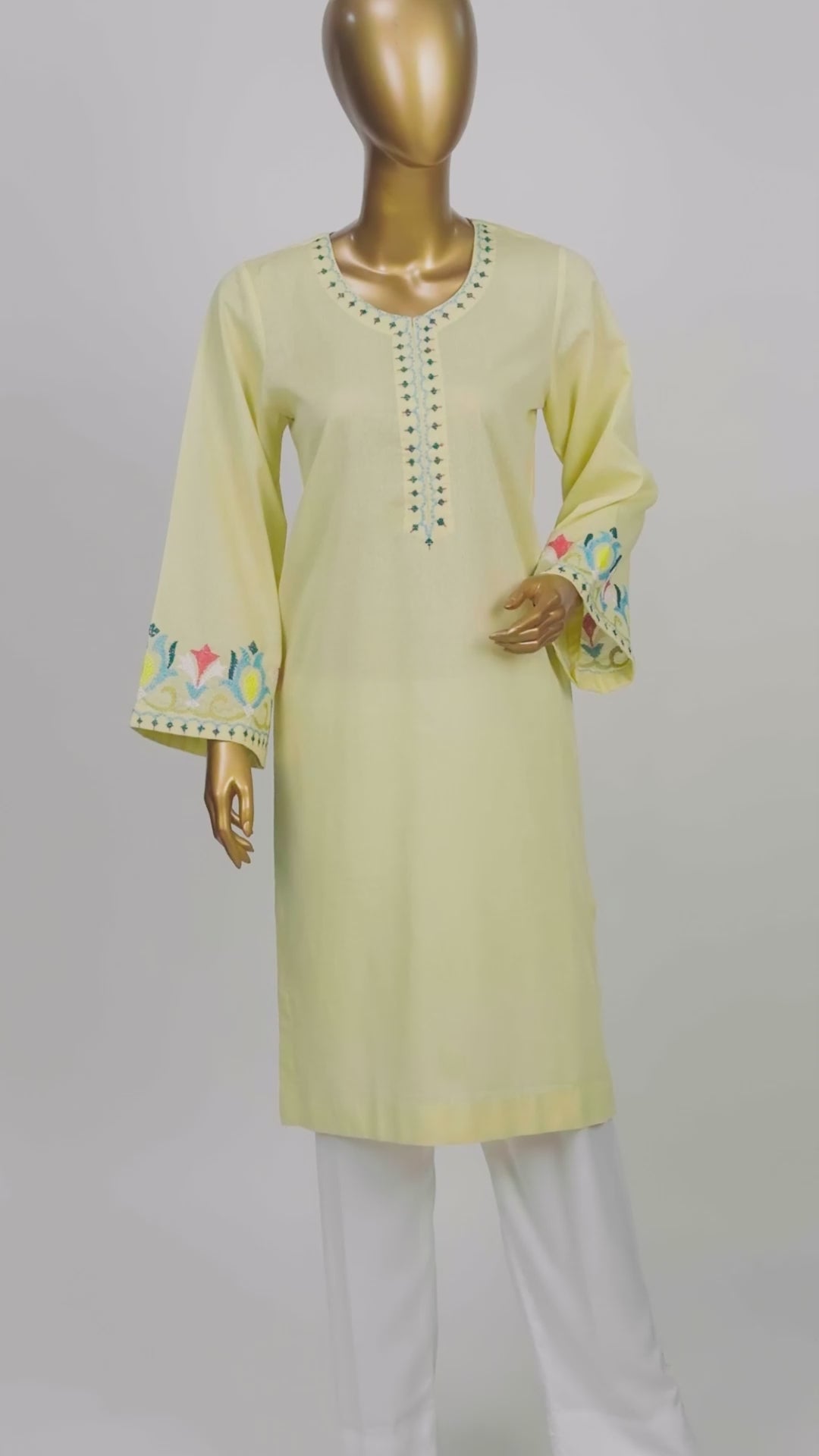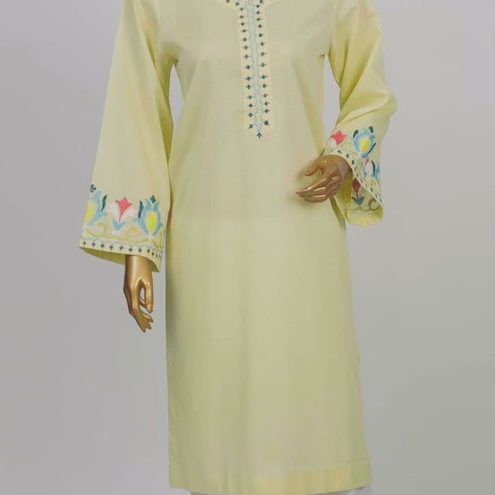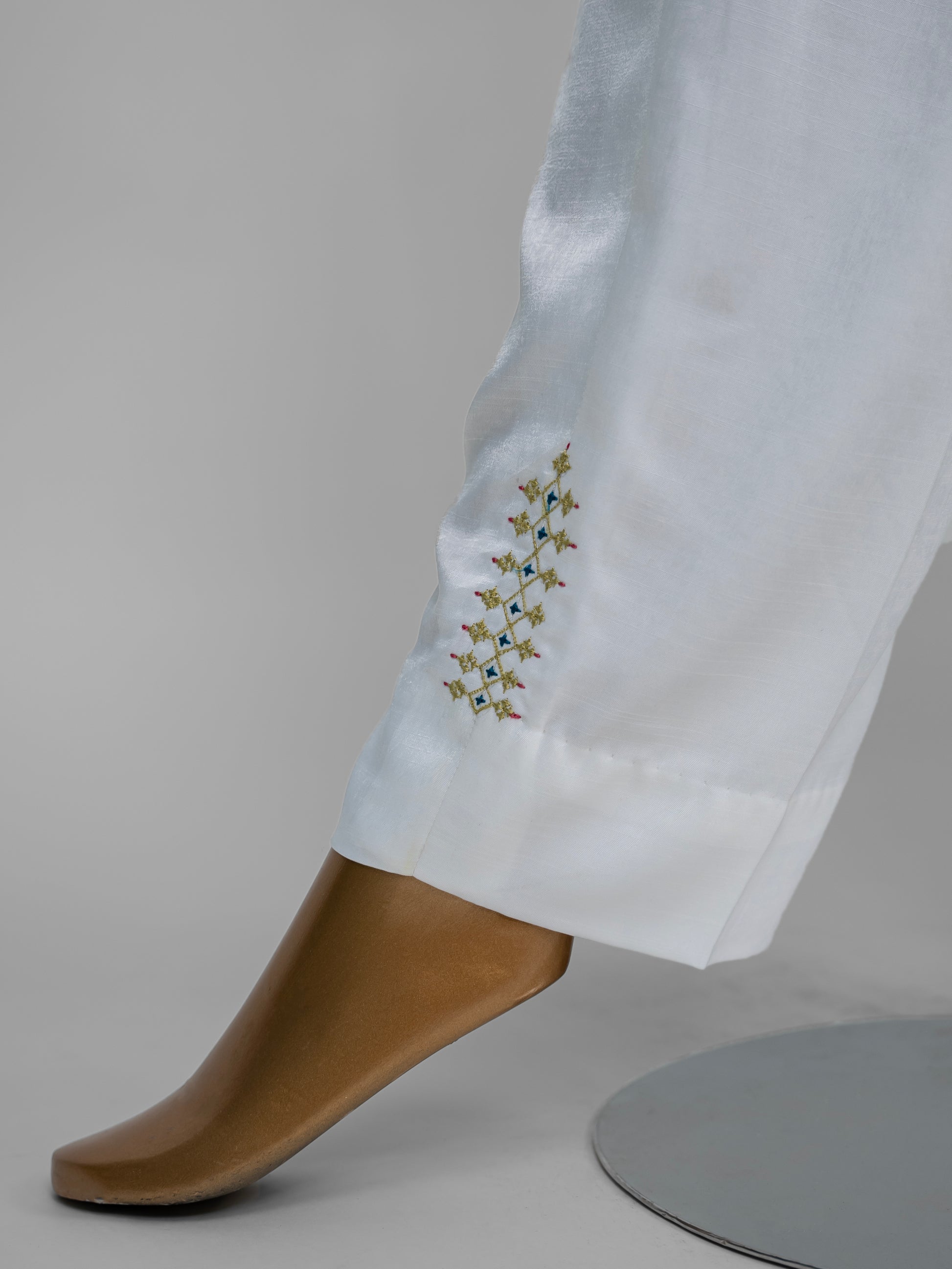 This elegant light yellow and offwhite 2-piece suit features a shirt with delicate cross-stitch embroidery on the sleeves and neckline. Plus, straight trousers with hand-tucked cross-stitch embroidery on the sides to complete the look.