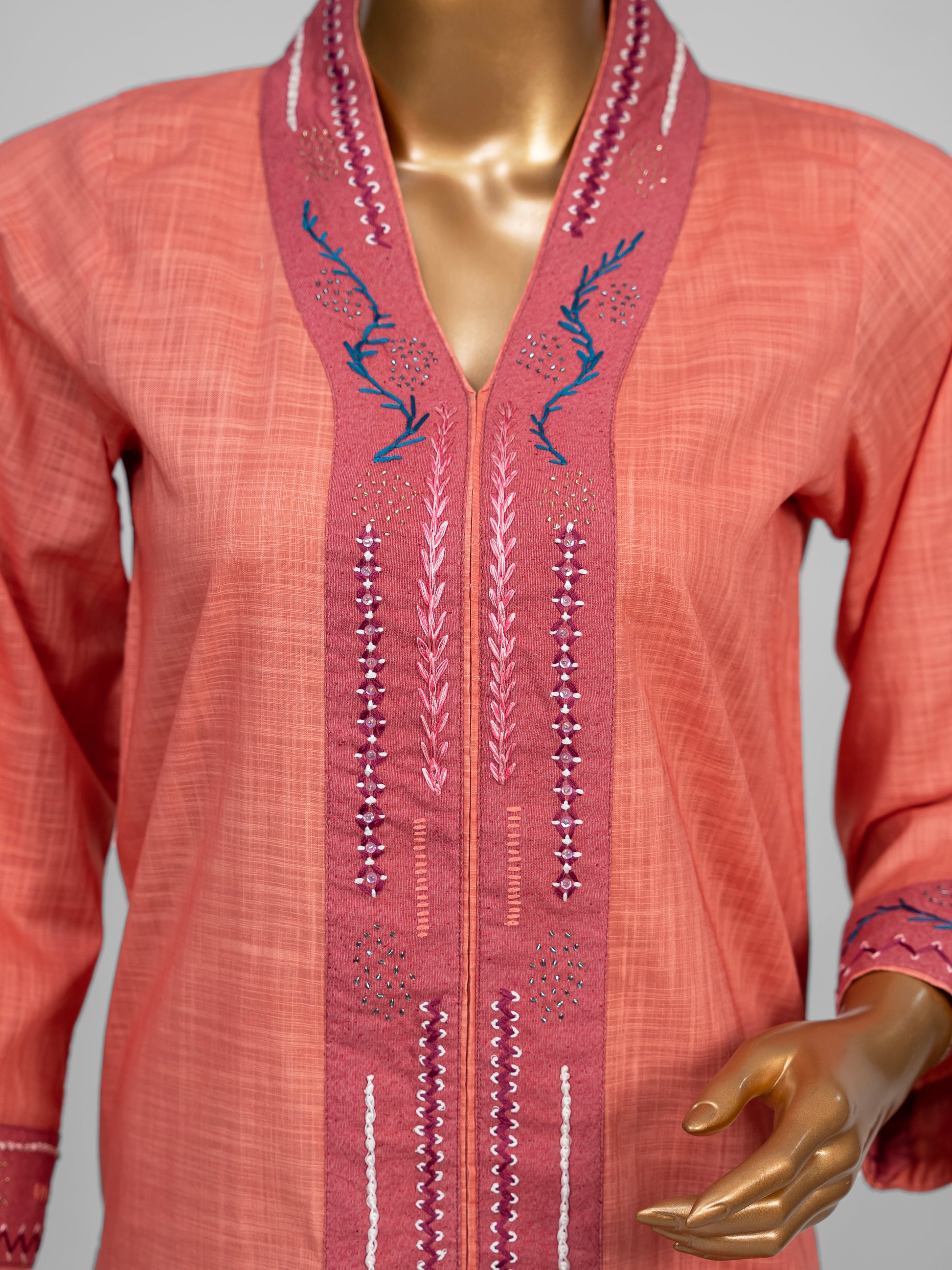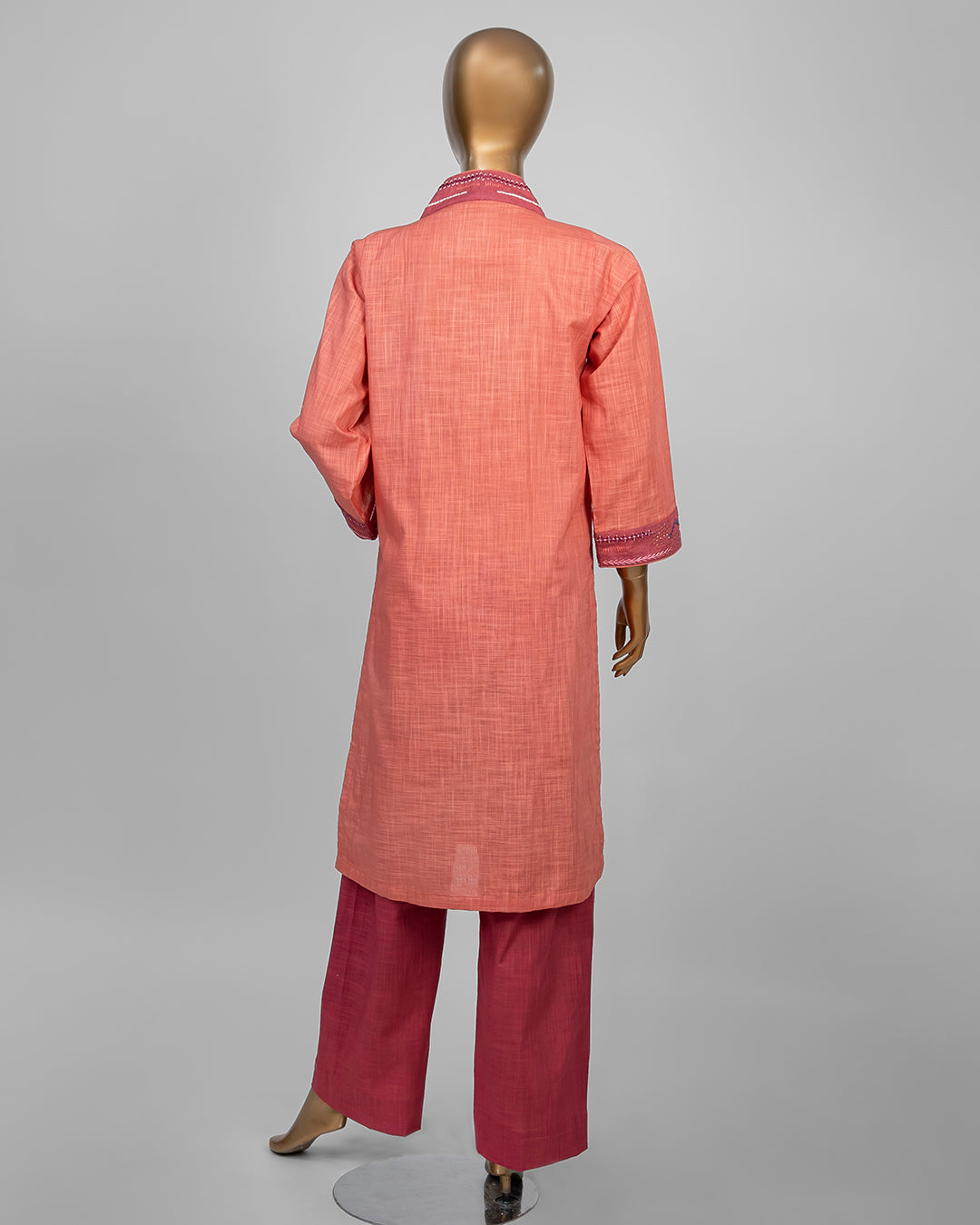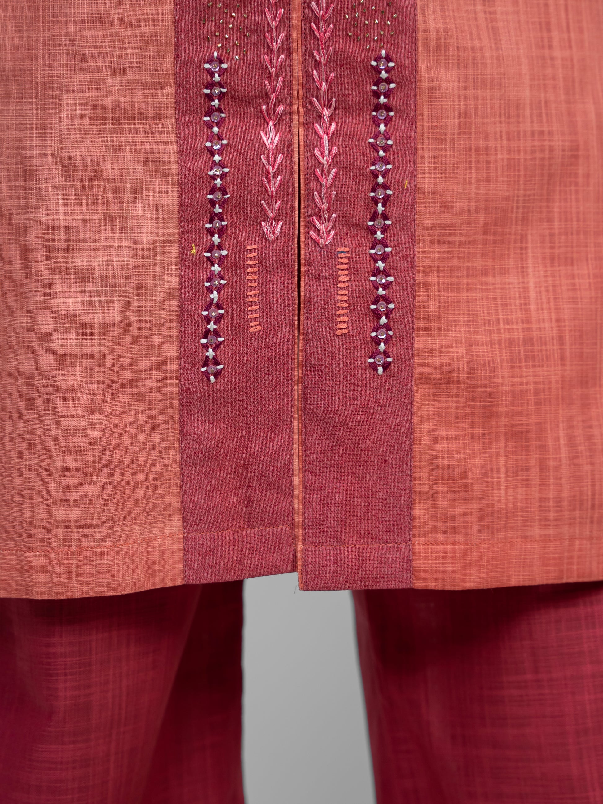 This pink 2-piece suit is made from soft self-cotton fabric, which offers both style and comfort. The medium pink shirt features beautiful hand embroidery on the sleeves and front, paired with dark pink straight trousers for a perfect, chic look.