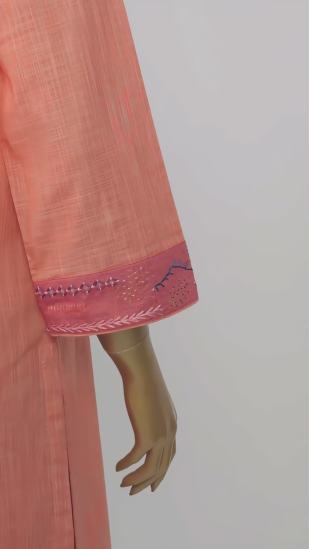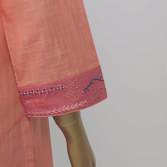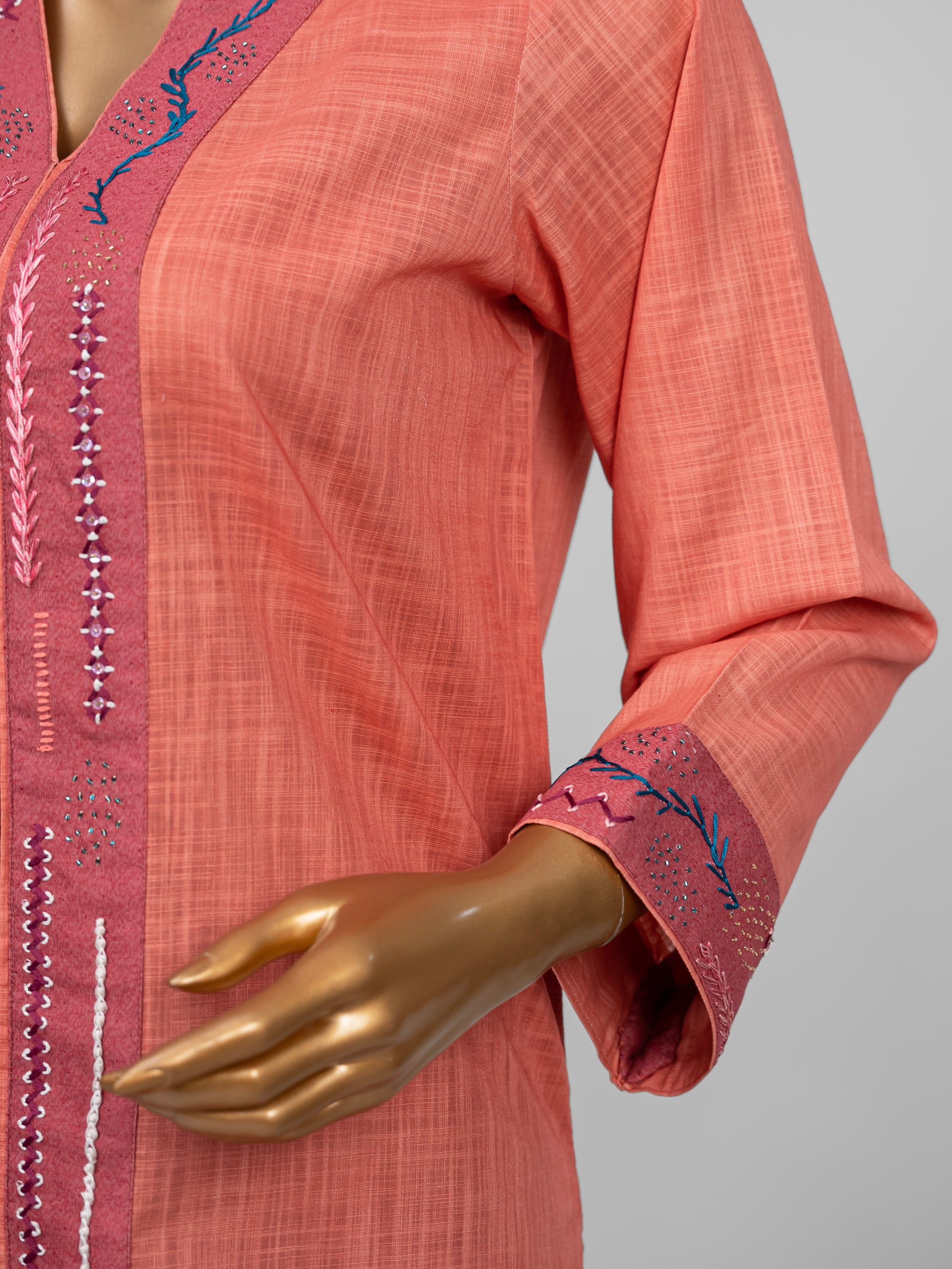 This pink 2-piece suit is made from soft self-cotton fabric, which offers both style and comfort. The medium pink shirt features beautiful hand embroidery on the sleeves and front, paired with dark pink straight trousers for a perfect, chic look.