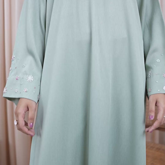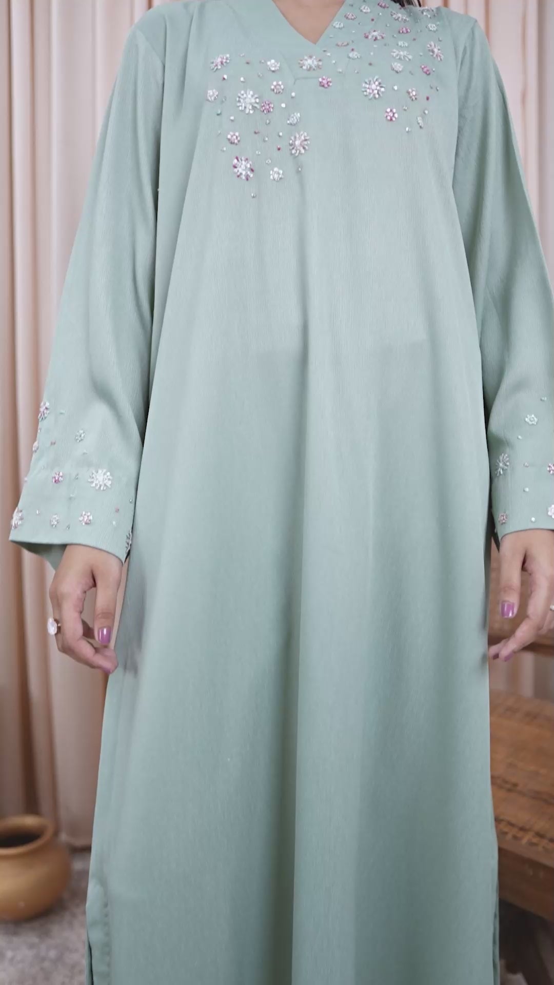 Enjoy the refined appeal of a graceful 2-piece outfit in textured mint-green fabric. The long shirt comes with beautiful hand embroidery on the neckline and sleeves, with a subtle side slit and a pair of straight trousers, creating nothing but an elegant silhouette.