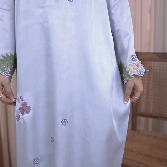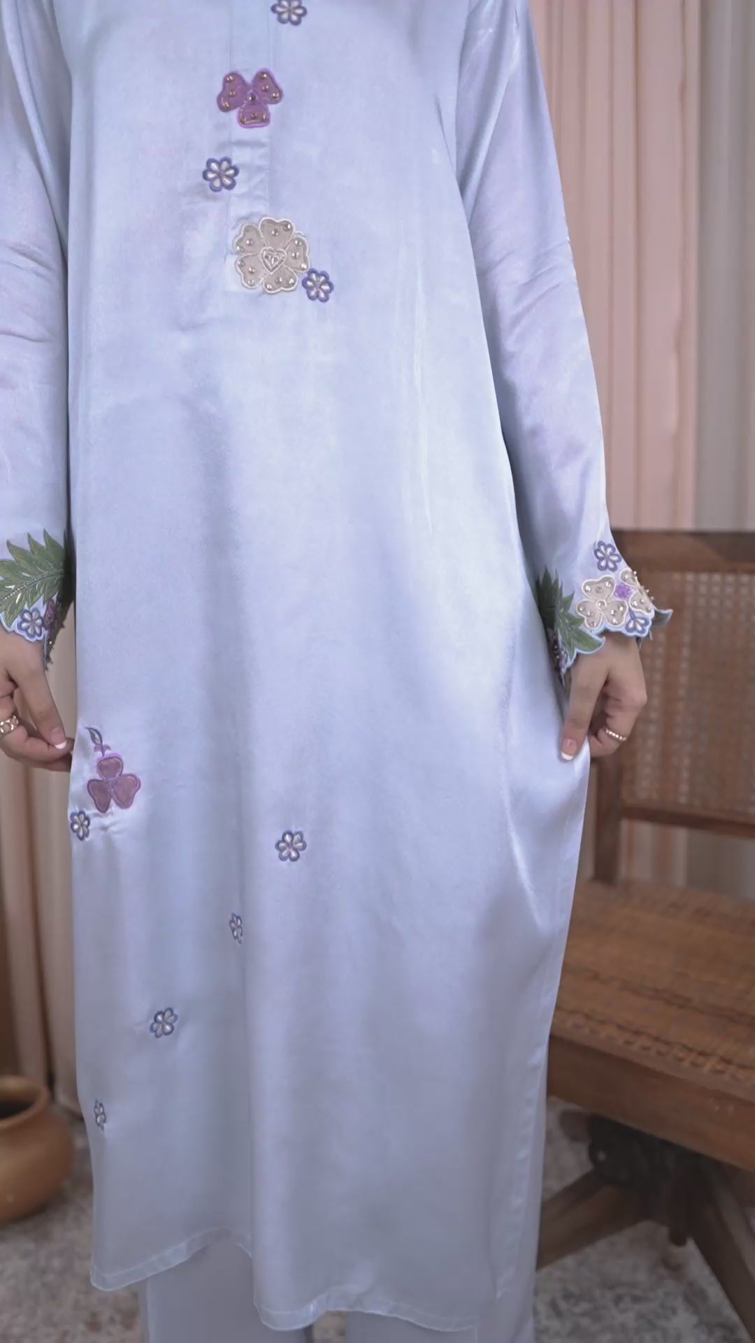 The powder blue 2-piece set is made from soft silk georgette, designed for subtle sophistication. The shirt features embroidery on the neckline, sleeves, and daman is delicately touched with hand embellishments. The shirt pairs effortlessly with loose trousers for a light and effortless look.