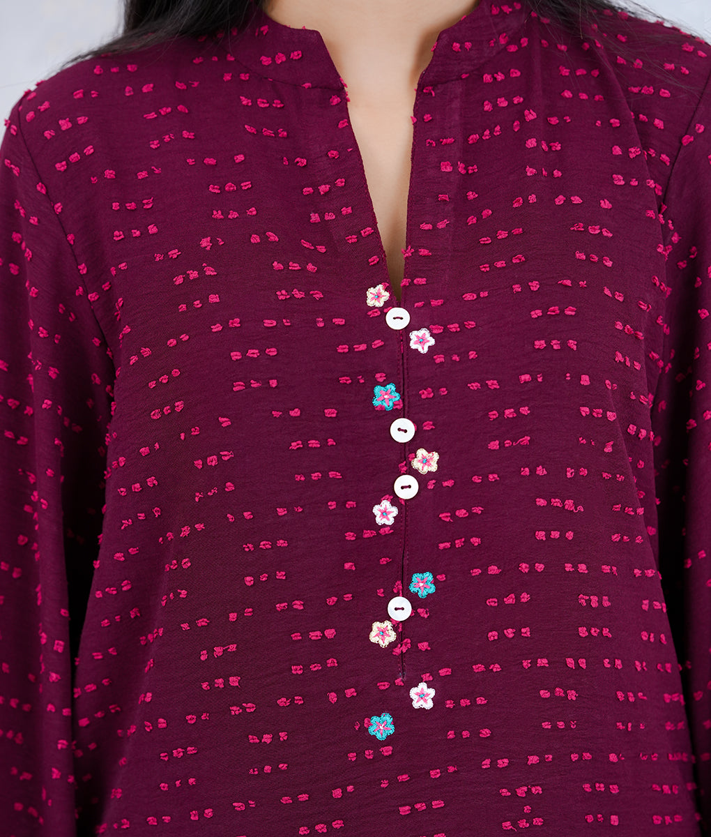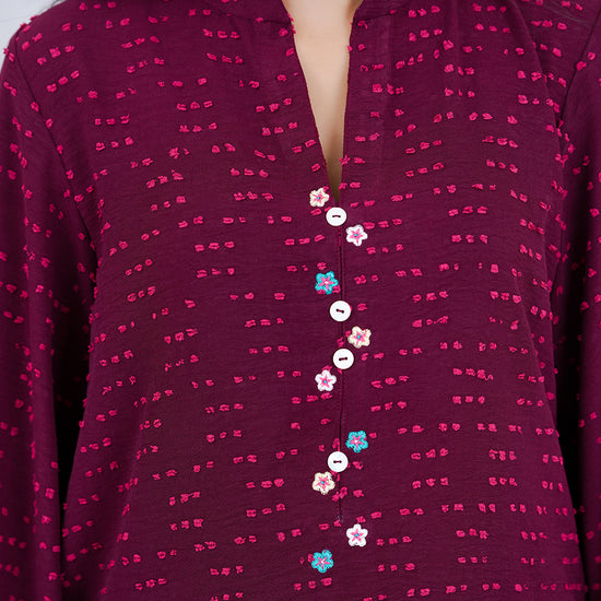 This maroon Co-Ord set is made from soft, textured, stretchable fabric, designed for both style and comfort. The short shirt is adorned with a delicate, embroidered neckline and folded sleeves; meanwhile, the straight trousers exude refined comfort to complete the ensemble.