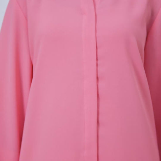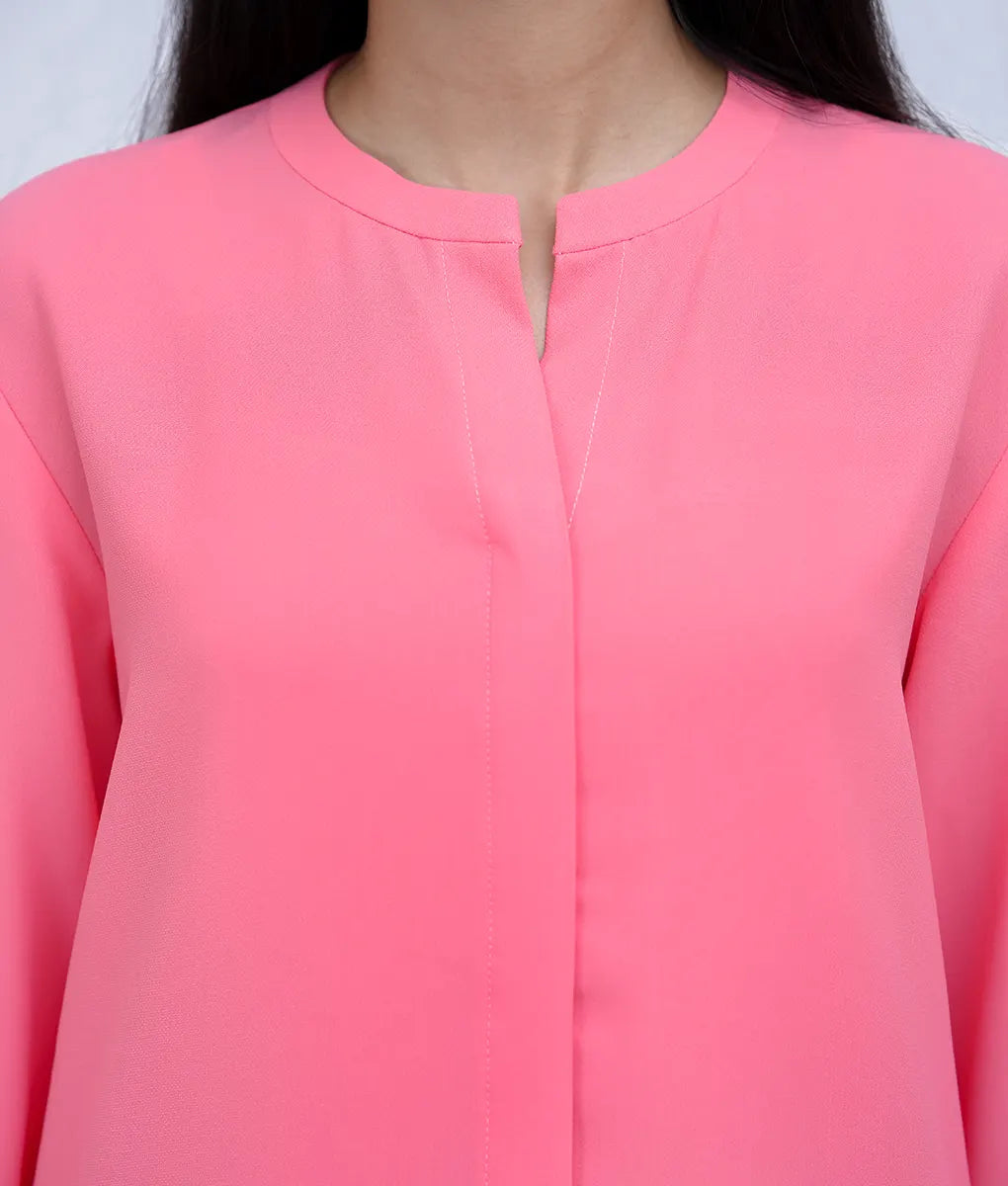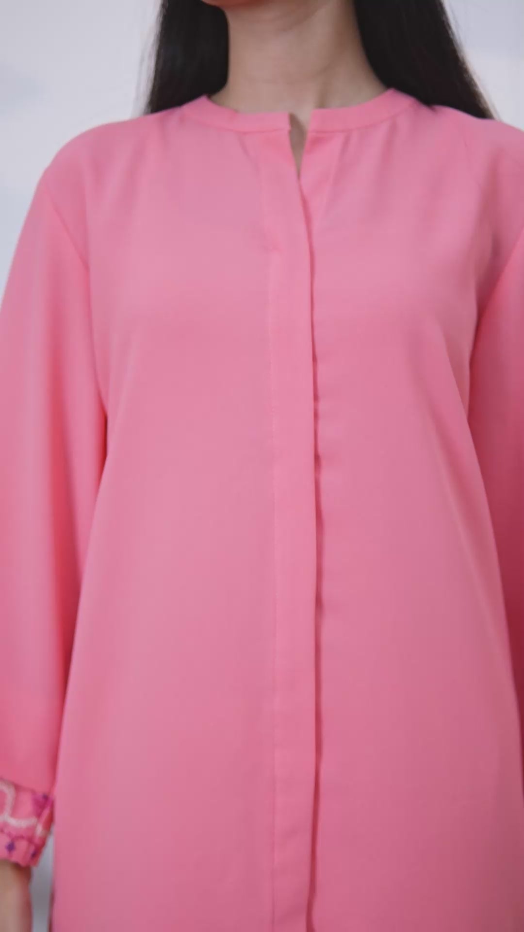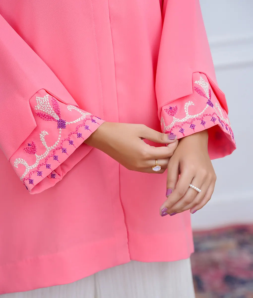 It’s a beautiful textured georgette outfit in pink and off white shades. The pink short open shirt comes with embroidered double sleeves that beautifully complement the button, off white stretchable flared trousers.