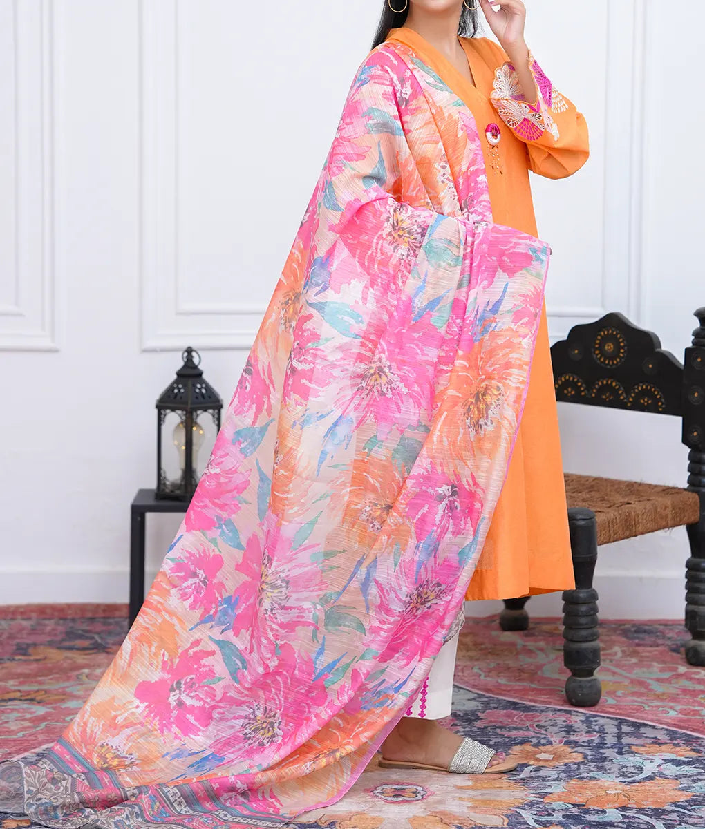 Refresh your casual wardrobe with the beautiful Orange/off-white 3-piece outfit, crafted from khaadi self-cotton. The shirt features detailed sleeve cutwork embroidery and box pleats on the front, finished with handmade studs. Paired with an embroidered off-white trouser and a charming digital floral printed dupatta for a graceful and comfortable look.